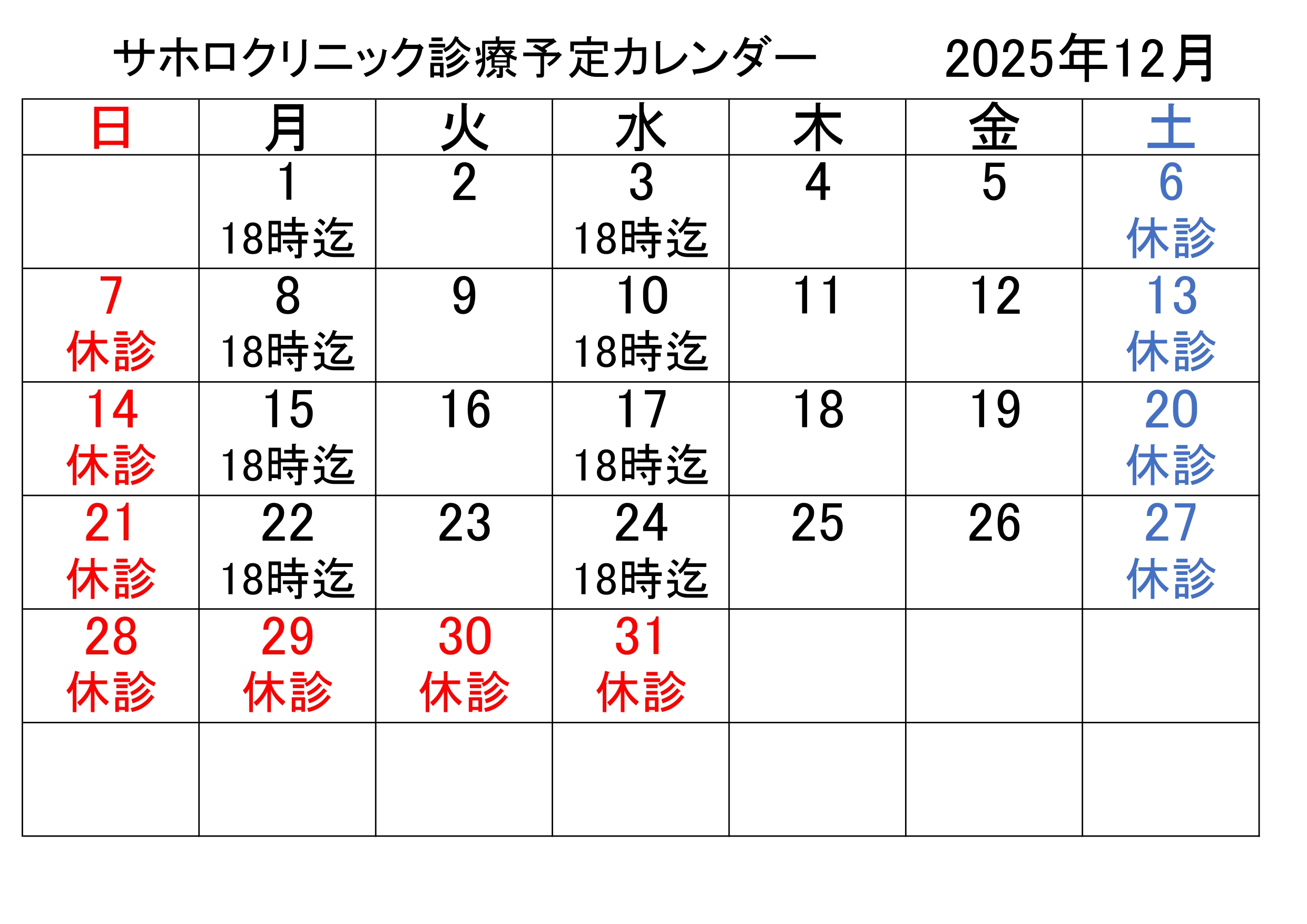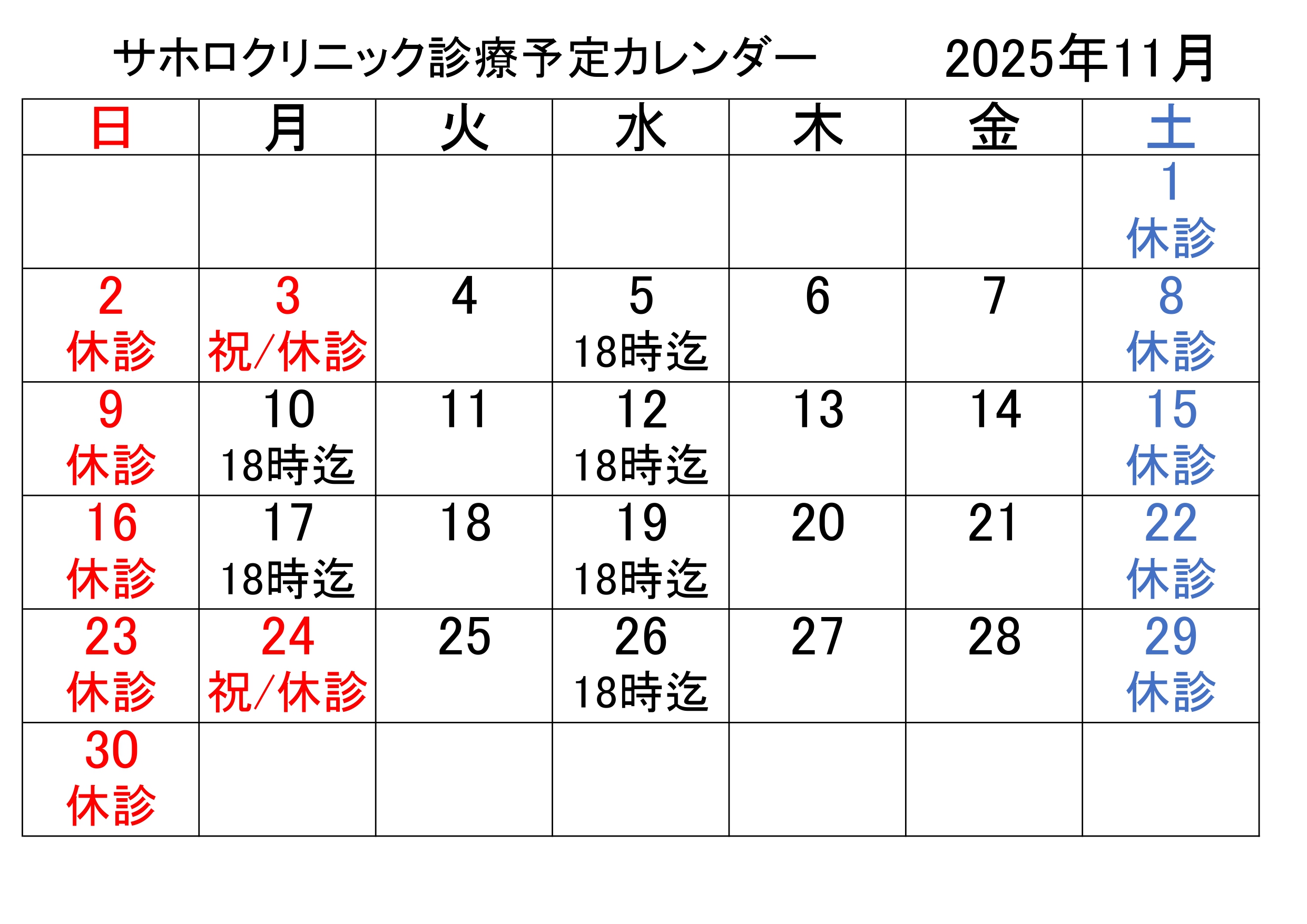 カレンダーは変更になる事があります。ホームの「クリニックからのお知らせ」又は院内の掲示板を直接ご確認ください。お急ぎの時は直接お問合せください。尚、午後の検査予定や臨時休診については受診前にお電話でのご確認をお願いいたします。