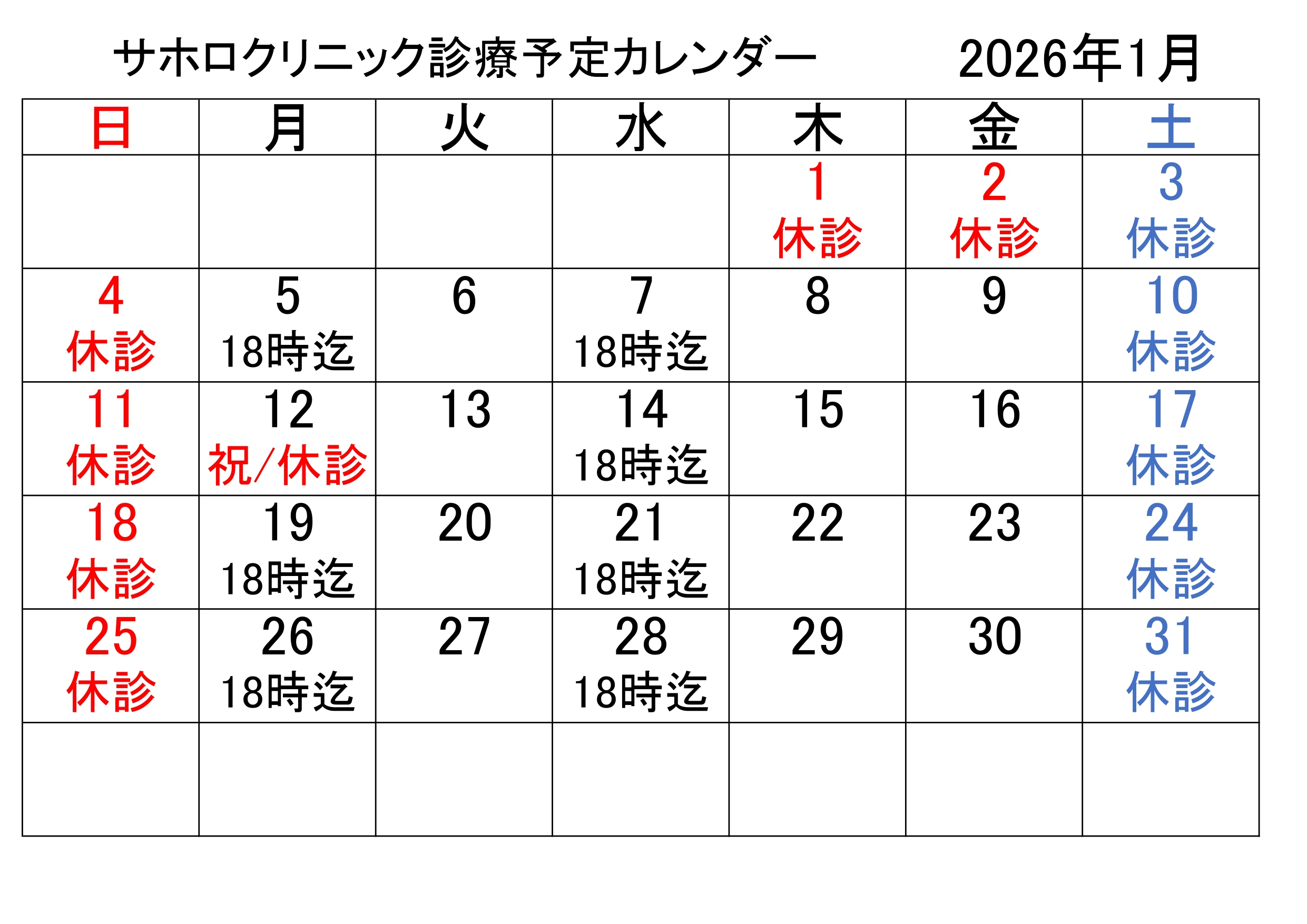 カレンダーは変更になる事があります。ホームの「クリニックからのお知らせ」又は院内の掲示板を直接ご確認ください。お急ぎの時は直接お問合せください。尚、午後の検査予定や臨時休診については受診前にお電話でのご確認をお願いいたします。